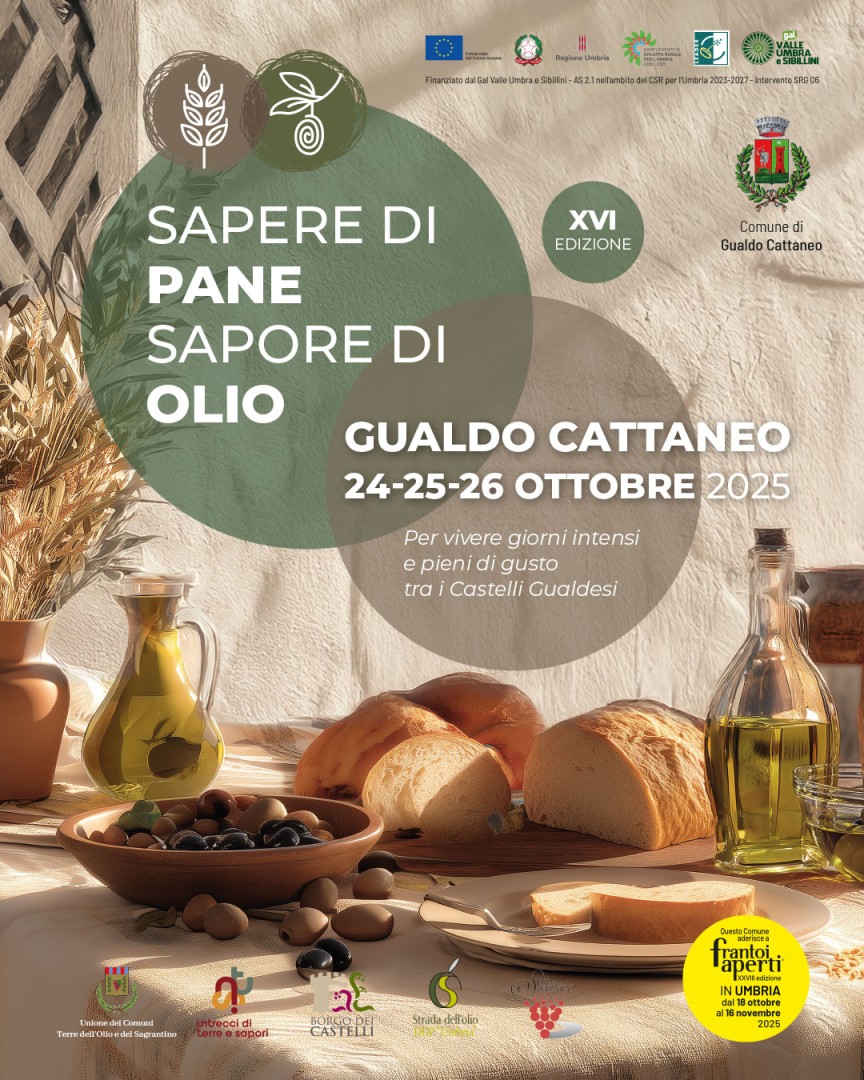 Ore 17.30 "PANE E OLIO DA RECORD: 20 METRI DI SAPORE IN PIAZZA"Una scenografica composizione di pane fresco condi-to con l'Olio extravergine di oliva nuovo dei frantoi del territorio attraverserà la piazza di Gualdo Cattaneo.
